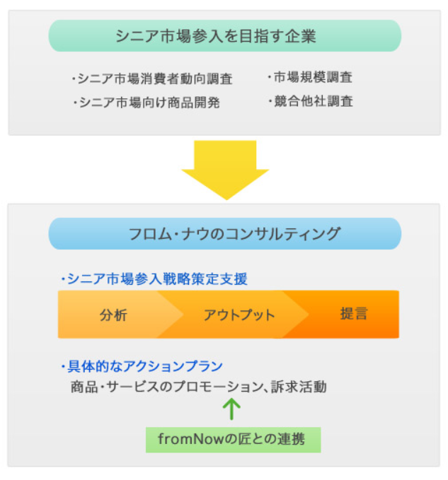 具体的には、フロムナウ独自の方法論によりシニア層の生の声を余すことなく分析することによって、商品やサービスなどを成功に導くための事業戦略策定とマーケティング改革に向けたコンサルティングサービスです。